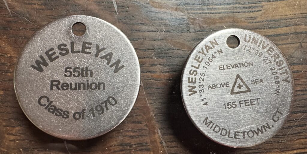 A limited number of keychains/zipper pulls commemorating the 55th Reunion are available. One side has a geographical information about Wesleyan in the format of a geophysical marker. The other side has the reunion information. If interested, please contact me by email.