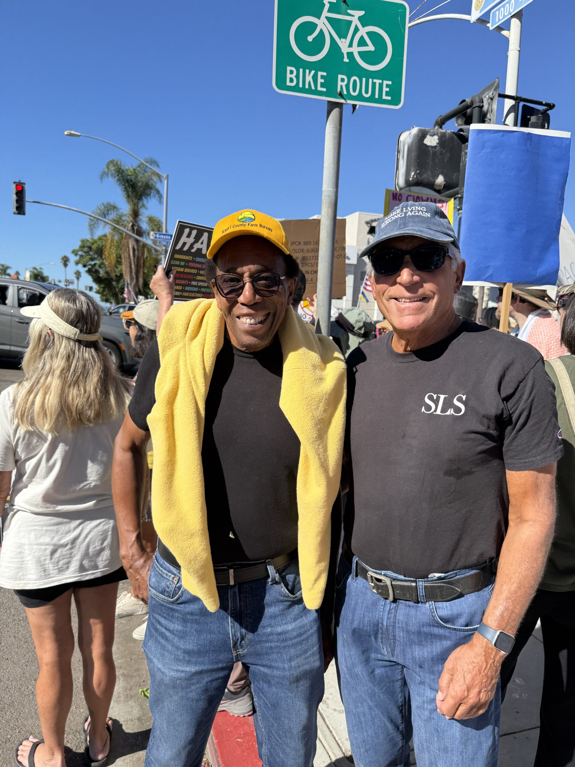 Ran into Stephen Ferruolo at No Kings rally in La Jolla, California, where we both reside. He provided a picture of us on the corner. Been attending many of these rallies around the country—there always seems to be one everywhere I go, including red states!