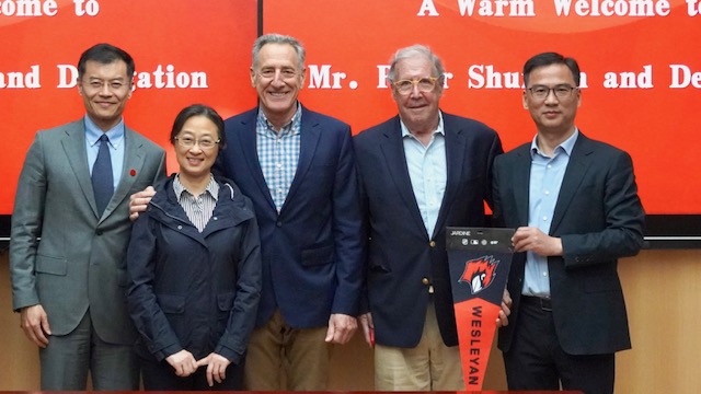 We have lots of news from Mike McKenna, who tells me that as he speeds toward his 75th year, “life continues to be interesting and enjoyable.” In April, he accompanied Vermont governor Peter Shumlin ’79 on a trip to visit schools in China, encouraging exchange students regardless of the current political climate. He writes, “Here we are with leaders of the highly regarded Nanjing Foreign Language School. Although not representing Wes in any formal way, we did leave Cardinal pennants at each campus we visited, which were well received.” He said later that month marked the 100th anniversary of Wesleyan men’s soccer on campus. Generations of former Cardinals attended and held career workshops with current players and played some lively alumni games. “I wisely did not bring my boots,” he said. Mike also said the busy day was “followed by dinner. Alums from the mid-60s on, including Rick Edwards in our class, Dr. Skip Nelson ’74, and former captain Dr. Pete Barnett ’72, who remembered taking my family on my first tour of campus with my folks and Coach Terry Jackson in 1969.”