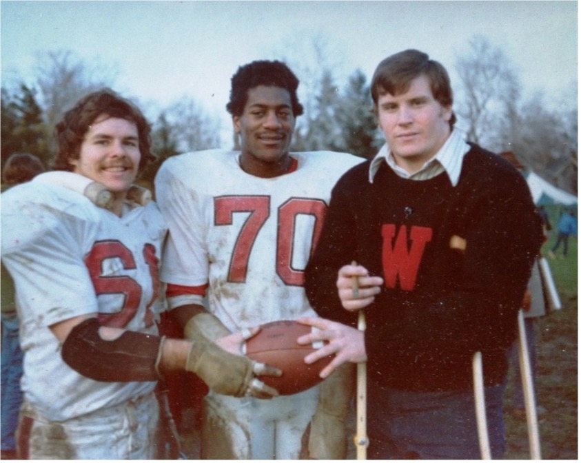 “Attached is a picture of myself, Pete McArdle, and Dennis Harrington. This is after the Trinity game in 1975. It’s the last football game the three of us ever played.”