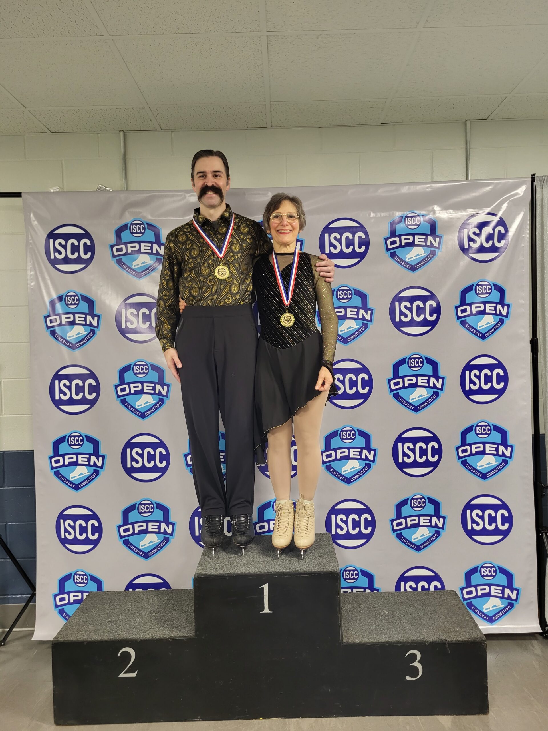 Elizabeth Weiss Ozorak has become a late-blooming competitive ice dancer. She sent a photo with her pro partner, Garrett Brockert, at the ISCC Open Competition in June where they won a gold medal. She would love to hear from any other adult skaters among us at eozorak@allegheny.edu.
