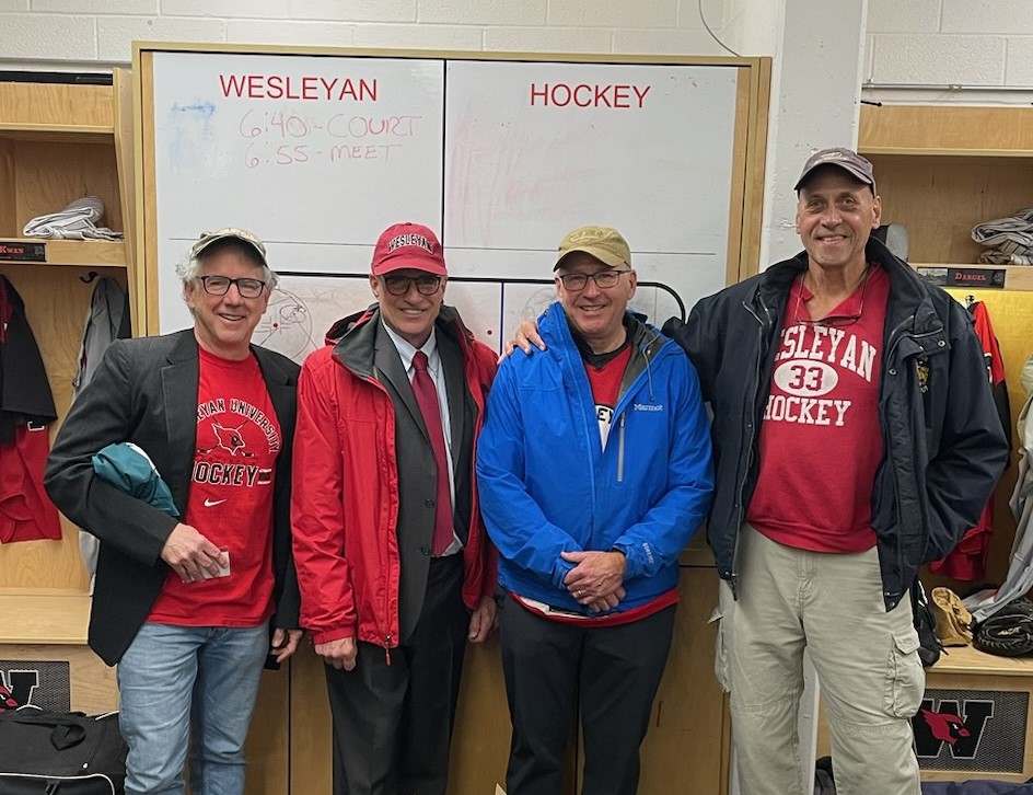 Jay Ash let us know that “the Duke Snyder memorial service was extremely well attended by players from the 1970s through the 2000s. Duke influenced all of us as hockey players and young men. The bonds we formed during each of our four years on the team remain to this day, and it was a blast to see so many of my former teammates this past April. For fear of leaving someone out, I won’t try to list everyone that I reconnected with.” CAPTION: From left to right: Chris Kincaid, Kyle Vietze ’81, Paul Godfrey ’81, and Jay Ash.]