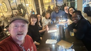 Peter Brastow writes that he and Carolyn Gencarella “and our two grown boys traveled to NYC over the holidays. We had an action-packed five days, based on 28th Street, where we stayed in a hotel with rooftop bar that had a spectacular view of the Empire State Building. We went to two shows (highly recommend Buena Vista Social Club!), a jazz club, the High Line, the World Trade Center, McSorley’s Old Ale House in the East Village, the Met, and the Park in the snow! Since the new mayor wasn’t sworn in until the New Year, we couldn’t track him down! We had yummy lunch (and a Vermut! for me) with Miriam Temin (who lives in Manhattan) at Little Spain. One day we went to the Tenement Museum and were joined there by Stephanie Donahue Pilla and her husband, who live in Harlem. After the incredible tour of the old houses where Jewish and Italian immigrants lived on Orchard Street, we were met by Andy Eig who led us to some delicious dim sum in Chinatown for Saturday brunch. Andy lives in Chelsea with his wife and grown children, with whom Carolyn and our kids and I also had dinner one night. On Monday [January 29], Carolyn [and I, plus] Andy and Stephanie, were joined at a fancy bar in NOMAD by Susan Wong (fellow Foss sixer whom I hadn’t seen since 1991!), Dave Belgrave (with whom Susan and I lived senior year at 107 Cross, and who has moved back to Brooklyn where he grew up), Iriss Shimony, and Linda Turnbull, both of whom live in Manhattan and are still rockin’ the New York financial world! It was so amazing to see old (ancient!) friends and to reconnect and feel that Wesleyan warmth after so many decades. Love you people!”